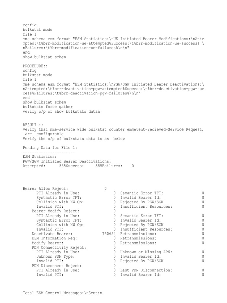 config bulkstat mode file 1 mme schema esm format "ESM Statistics:\nUE Initiated Bearer Modifications:\nAtte mpted:\t%brr-modification-ue-attempted%Success:\t%brr-modification-ue-success% \ nFailures:\t%brr-modification-ue-failures%\n\n"