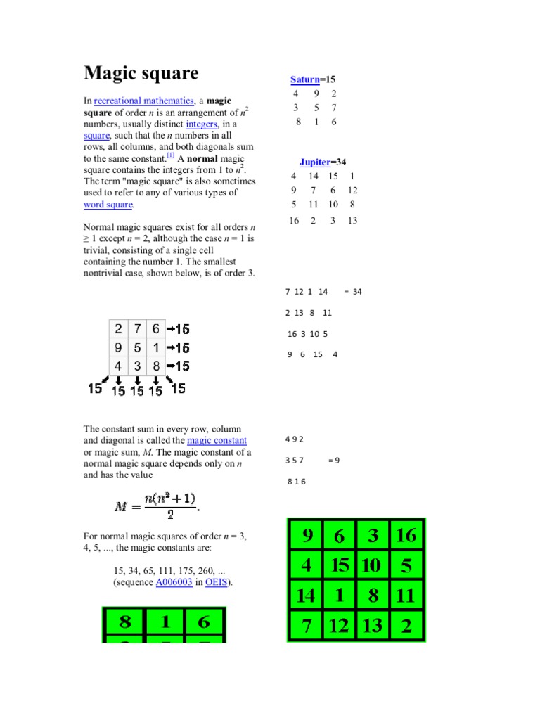 In recreational mathematics, a magic square of order n is an arrangement of n2 numbers, usually distinct integers, in a square, such that the n numbers in all rows, all columns, and both diagonals sum to the same constant.[1] A normal magic square contains the integers from 1 to n2. The term "magic square" is also sometimes used to refer to any of various types of word square. Normal magic squares exist for all orders n 1 except n = 2, although the case n = 1 is trivial, consisting of a single cell containing the number 1. The smallest nontrivial case, shown below, is of order 3.
