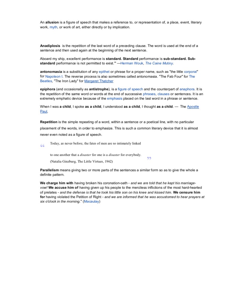 Anadiplosis is the repetition of the last word of a preceding clause. The word is used at the end of a sentence and then used again at the beginning of the next sentence. Aboard my ship, excellent performance is standard. Standard performance is sub-standard. Substandard performance is not permitted to exist.'" Herman Wouk, The Caine Mutiny. antonomasia is a substitution of any epithet or phrase for a proper name, such as "the little corporal" for Napoleon I. The reverse process is also sometimes called antonomasia. "The Fab Four" for The Beatles, "The Iron Lady" for Margaret Thatcher epiphora (and occasionally as antistrophe), is a figure of speech and the counterpart of anaphora. It is the repetition of the same word or words at the end of successive phrases, clauses or sentences. It is an extremely emphatic device because of the emphasis placed on the last word in a phrase or sentence. When I was a child, I spoke as a child, I understood as a child, I thought as a child. The Apostle Paul, Repetition is the simple repeating of a word, within a sentence or a poetical line, with no particular placement of the words, in order to emphasize. This is such a common literary device that it is almost never even noted as a figure of speech.
