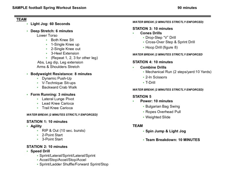 SAMPLE football Spring Workout Session TEAM Light Jog: 60 Seconds Deep Stretch: 6 minutes Lower Torso Both