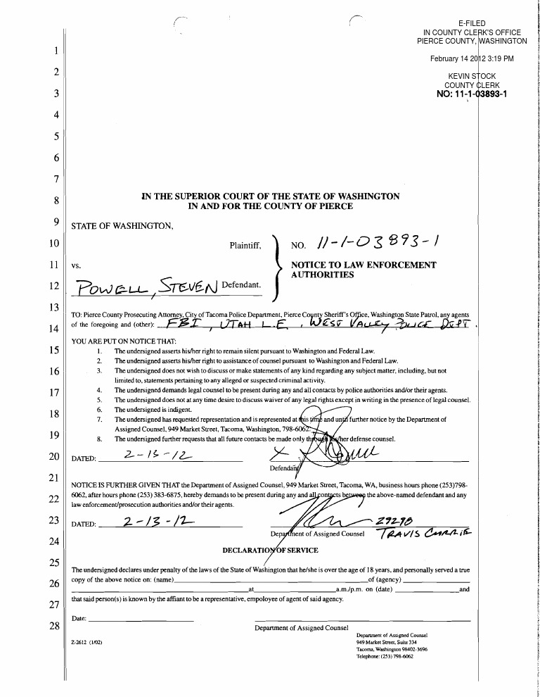 YOU ARE PUT ON NOTICE THAT: The undersigned asserts hisher right to remain silent pursuant to Washington and Federal Law. 1. The undersigned asserts hisher right to assistanceof counsel pursuant to Washington and Federal Law. 2. The undersigned does not wish to discuss or make statements of any kind regarding any subject matter. including, but not 3. limited to, statementspertaining to any alleged or suspected criminal activity. The undersigned demands legal counsel to be present during any and all contacts by poIice authorities andor their agents. 4. The undersigned does not at any time desire to discuss waiver of any legal rights except in writing in the presenceof legal counsel. 5. 6. The undersigned is indigent. The undersigned has requested representation and is represented at 7. Assigned Counsel, 949 Market Street, Tacoma, Washin The undersigned further requests that all future contacts 8. DATED: