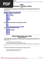 Bmw Code [Link] 0x0127002D 45 Multifunction steering wheel, monitoring, interface 0x01270032 50 Activation,solenoid value,fuel-circuit changeover(OBDII:P1145) 0x01270035 53 Activation, idle-speed control valve/opening coil (OBDII:P1509; EUIII:P0505) 0x01270037 55 Activation, OX.-sensor heater before cat. conv., bank 2 (OBDII:P0155; EUIII:P0155) 0x01270038 56 Signal, ignition-current measurement, resistance 0x01270039 57 Signal, knock sensor 1 (OBDII:P0325; EUIII:P0325) 0x0127003B 59 Signal, Knock sensor 2 (OBDII:P0330; EUIII:P0330) 0x0127003D 61 Activation, OX-sensor heater after cat. conv., bank 2 (OBDII:P0141; EUIII:P0141) 0x01270041 65 Signal, inlet-camshaft sensor (OBDII:P0340; EUIII:P0340) 0x01270044 68 Activation, solenoid valve, tank ventilation (OBDII:P0443; EUIII:P0443) 0x01270045 69 Activation, fuel-pump relay 0x0127004A 74 Activation, A/C compressor 0x0127004F 79 Activation, OX.-sensor heater after cat. conv., bank 1 (OBDII:P0161; EUIII:P0161) 0x01270053 83 Signal, crankshaft sensor (OBDII:P0335; EUIII:P0335) 0x01270064 100 Control units, self-test (OBDII:P0601; EUIII:P0601) 0x01270067 103 Control VANOS, end-pos. fault, inlet camshaft (OBDII:P1519) 0x01270068 104 Control VANOS, end-pos. fault, exhaust camshaft (OBDII:P1520) 0x01270069 105 Control VANOS, position, inlet camshaft (OBDII:P1522) 0x0127006A 106 Control VANOS, position, exhaust camshaft (OBDII:P1523) 0x0127006D 109 Engine throttle, plausibility, activation duty factor (OBDII:P1580; EUIII:P0505) 0x0127006E 110 Signal, pedal-travel sensor (in thr.), pot. 1 (OBDII:P1542; EUIII:P0220) 0x0127006F 111 Signal, pedal-travel sensor (in thr.), pot. 2 (OBDII:P1542; EUIII:P0220) 0x01270070 112 Signal, throttle sensor, potentiometer 1 (OBDII:P0120; EUIII:P0120) 0x01270071 113 Signal, throttle sensor, Potentiometer 2 (OBDII:P0120; EUIII:P0120) 0x01270072 114 Activation, engine throttle (OBDII:P1580; EUIII:P0505) 0x01270073 115 Reference voltage 1, pedal-travel sensor/throttle sensor 1 (OBDII:P1623; EUIII:P0608) 0x01270074 116 Reference voltage 2, pedal-travel sensor/throttle sensor 2 (OBDII:P1623; EUIII:P0608) 0x01270075 117 Plausibility, signal, pedal-travel sensor (in thr.) pot. 1/2 (OBDII:P1542; EUIII:P0220) 0x01270076 118 Plausibility, signal, engine-throttle sensor, potentiometer (OBDII:P0120; EUIII:P0120) 0x01270077 119 Engine trottle, mechanical fault (sluggish/stuck) (OBDII:P1580; EUIII:P0505) 0x01270078 120 Plausibility, pedal-travel sensor (in thr.), throttle sensor (OBDII:P1542; EUIII:P0220) 0x0127007A 122 Signal, engine-oil temperature sensor (OBDII:P1161) 0x0127007B 123 Activation, map cooling (OBDII:P1622) 0x0127007C 124 Activation, solenoid valve, intake manifold (OBDII:P1593) 0x0127007D 125 Activation, electric fan 0x0127007E 126 Activation,solenoid value,tank-leak diagnosis pump(OBDII:P1479;EUIII:P0440) 0x01270080 128 DME-EWS interface 0x0127008C 140 Tank-leak diagnosis pump,reed switch not closed(OBDII:P1475;EUIII:P0440) 0x0127008D 141 Tank-leak diagnosis pump,reed switch not open(OBDII:P1477;EUIII:P0440) 0x01270091 145 Fuel system,minor leak detected;fuel cap possibly not secured(OBDII:P0455) 0x01270095 149 Plausibility fault, air mass to pedal-tr. sensor (in eng. thr.) (OBDII:P1140; EUIII:P0101) 0x01270096 150 Signal, [Link] before cat. conv., bank 1, max. value exceeded (OBDII:P0130; EUIII:P0130) 0x01270097 151 Signal, [Link] before cat. conv., bank 1, min. value undershot Page 26
