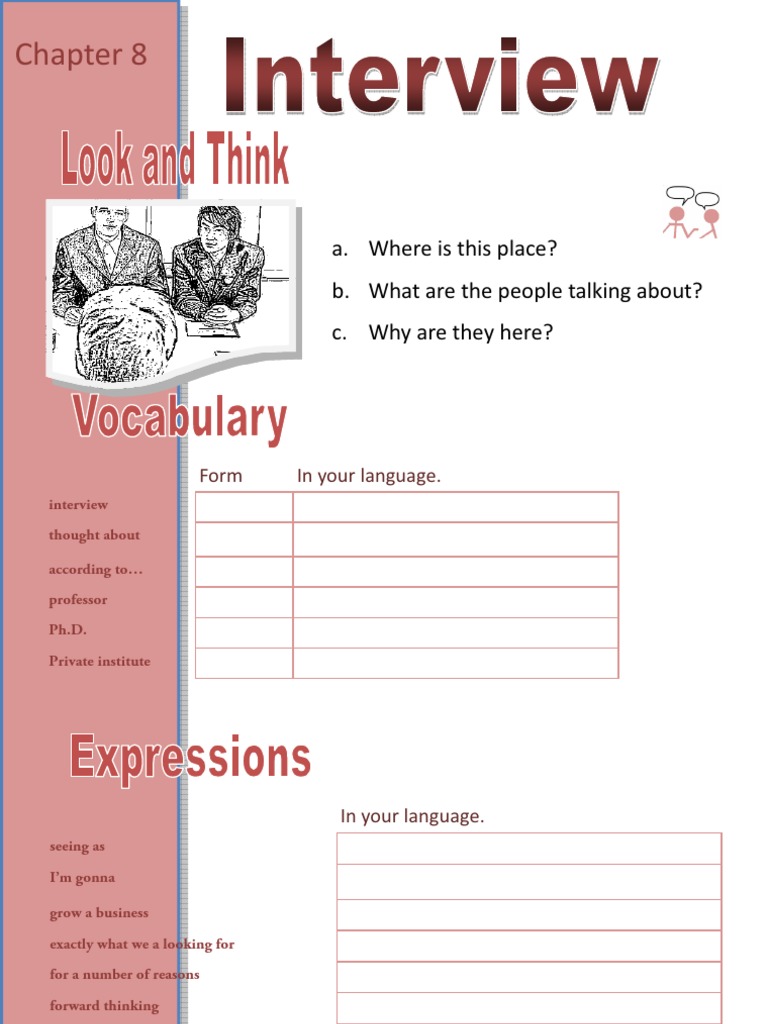 Write your own role play. Look at the expression and vocabulary from the rst page The interviewer asks about the interviewees future and why they want to work at this company, also what their special skills are.