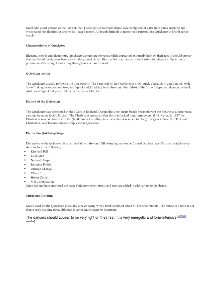 and syncopated feet rhythms in time to fast-paced music. Although difficult to master and perform, the Quickstep is lots of fun to watch. Characteristics of Quickstep Elegant, smooth and glamorous, Quickstep dancers are energetic while appearing extremely light on their feet. It should appear that the feet of the dancers barely touch the ground. Much like the Foxtrot, dancers should strive for elegance. Upper body posture must be straight and strong throughout each movement. Quickstep Action The Quickstep usually follows a 4/4 time pattern. The basic feel of the Quickstep is slow-quick-quick, slow-quick-quick, with "slow" taking beats one and two, and "quick-quick" taking beats three and four. Most of the "slow" steps are taken on the heel, while most "quick" steps are taken on the balls of the feet. History of the Quickstep The Quickstep was developed in the 1920s in England. During this time, many bands began playing the Foxtrot at a faster pace, earning the name Quick Foxtrot. The Charleston appeared after this, but lacked long-term potential. However, in 1927 the Charleston was combined with the Qucik Foxtrot resulting in a name that was much too long: the Quick Time Fox Trot and Charleston, so it became known simply as the Quickstep. Distinctive Quickstep Steps Distinctive to the Quickstep is an up-and-down, rise-and-fall swinging motion performed at a fast pace. Distinctive Quickstep steps include the following: Rise and Fall Lock Step Natural Hairpin Running Finish Outside Change Chasse' Hover Corte' V-6 Combination Once dancers have mastered the basic Quickstep steps, turns, and runs are added to add variety to the dance. Music and Rhythm Music used for the Quickstep is usually jazz or swing with a brisk tempo of about 50 beats per minute. The tempo is a little faster than a brisk walking pace, although it seems much faster to beginners.