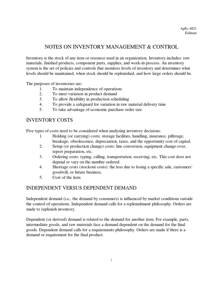 NOTES ON INVENTORY MANAGEMENT & CONTROL