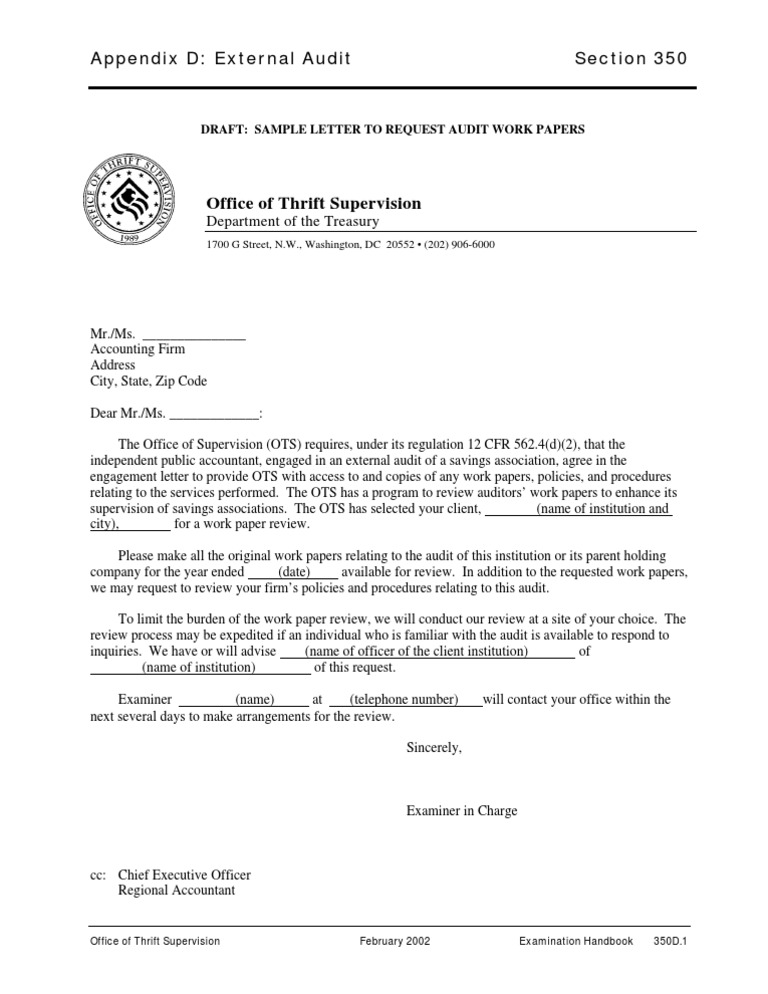 Mr./Ms. _______________ Accounting Firm Address City, State, Zip Code Dear Mr./Ms. _____________: The Office of Supervision (OTS) requires, under its regulation 12 CFR 562.4(d)(2), that the independent public accountant, engaged in an external audit of a savings association, agree in the engagement letter to provide OTS with access to and copies of any work papers, policies, and procedures relating to the services performed. The OTS has a program to review auditors work papers to enhance its supervision of savings associations. The OTS has selected your client, (name of institution and city), for a work paper review. Please make all the original work papers relating to the audit of this institution or its parent holding company for the year ended (date) available for review. In addition to the requested work papers, we may request to review your firms policies and procedures relating to this audit. To limit the burden of the work paper review, we will conduct our review at a site of your choice. The review process may be expedited if an individual who is familiar with the audit is available to respond to inquiries. We have or will advise (name of officer of the client institution) of (name of institution) of this request. (name) at (telephone number) Examiner next several days to make arrangements for the review. Sincerely, will contact your office within the