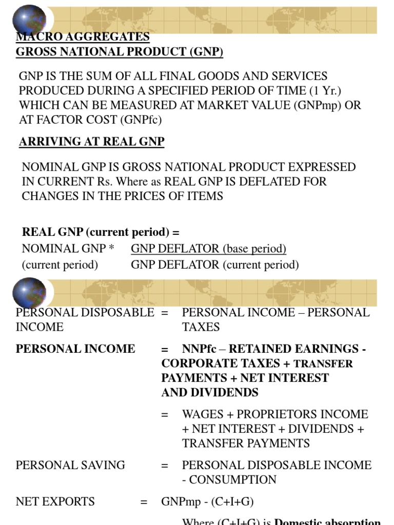 DURING A SPECIFIED PERIOD OF TIME (1 Yr.) WHICH CAN BE MEASURED AT MARKET VALUE (GNPmp) OR AT FACTOR COST (GNPfc) ARRIVING AT REAL GNP NOMINAL GNP IS GROSS NATIONAL PRODUCT EXPRESSED IN CURRENT Rs. Where as REAL GNP IS DEFLATED FOR CHANGES IN THE PRICES OF ITEMS