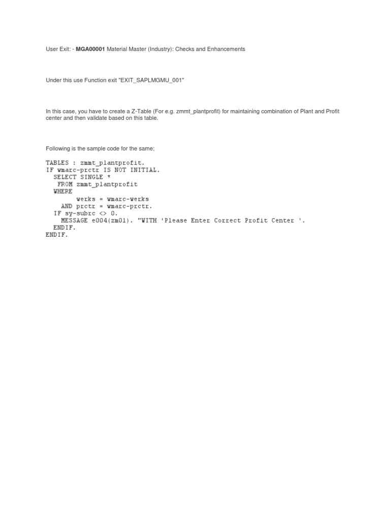 In this case, you have to create a z-table (For e.g. Zmmt_plantprofit) for maintaining combination of Plant and Profit center and then validate based on this table. Following is the sample code for the same; TABLES : zMMT_plantprofit IF wmarc-werks is NOT INITIAL.