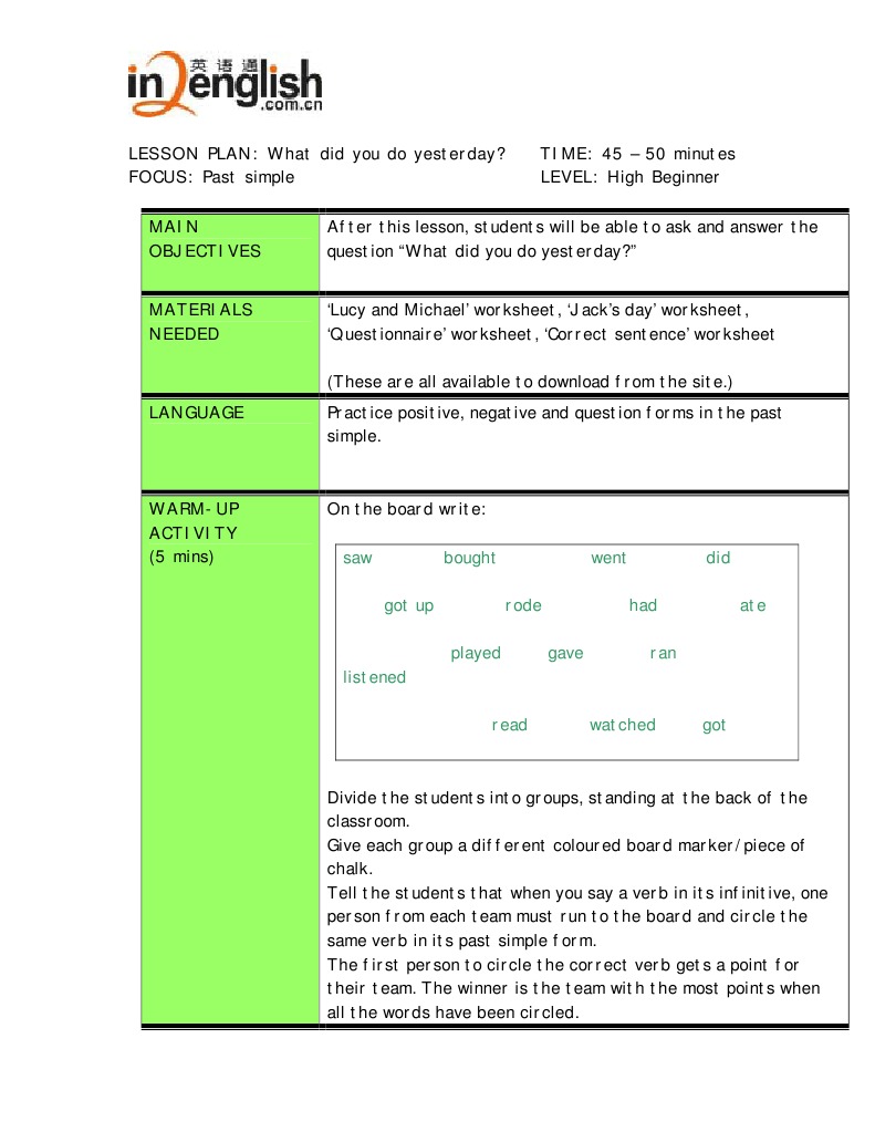 LESSON PLAN: What did you do yesterday?