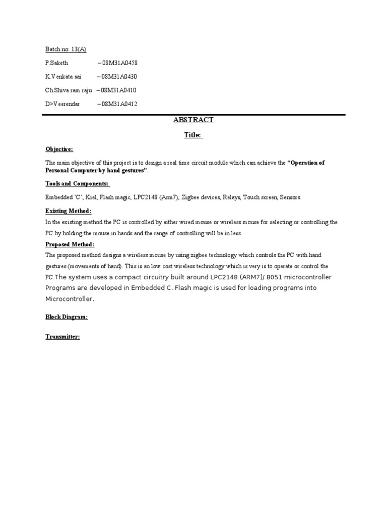 Objective: The main objective of this project is to design a real time circuit module which can achieve the Operation of Personal Computer by hand gestures. Tools and Components: Embedded C, Kiel, Flash magic, LPC2148 (Arm7), Zigbee devices, Relays, Touch screen, Sensors. Existing Method: In the existing method the PC is controlled by either wired mouse or wireless mouse for selecting or controlling the PC by holding the mouse in hands and the range of controlling will be in less. Proposed Method: The proposed method designs a wireless mouse by using zigbee technology which controls the PC with hand gestures (movements of hand). This is an low cost wireless technology which is very is to operate or control the PC.The system uses a compact circuitry built around LPC2148 (ARM7)/ 8051 microcontroller Programs are developed in Embedded C. Flash magic is used for loading programs into Microcontroller. Block Diagram: Transmitter: