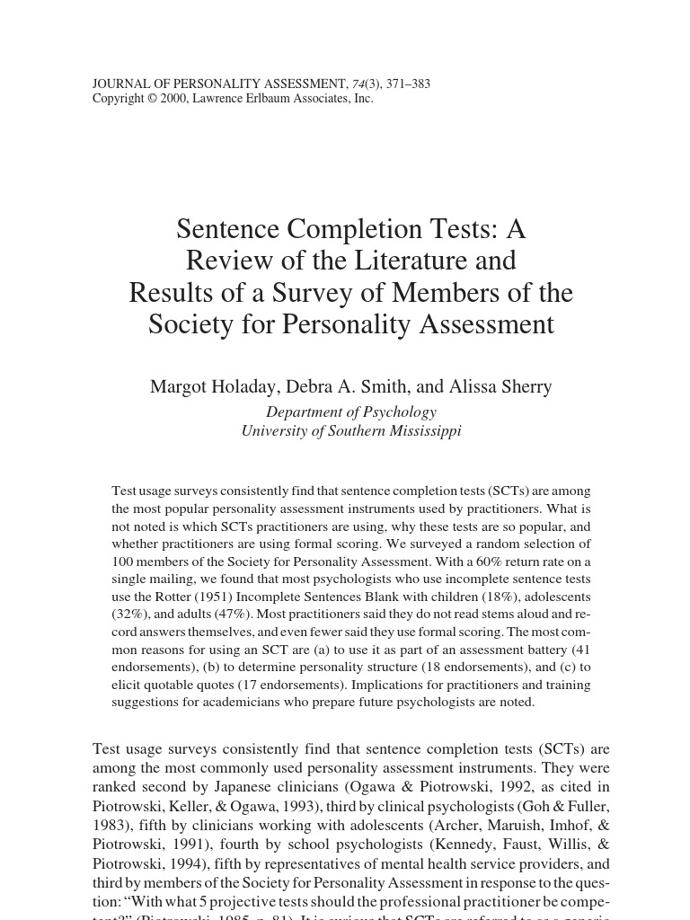 Sentence Completion Tests: A Review of the Literature and Results of a Survey of Members of the Society for Personality Assessment