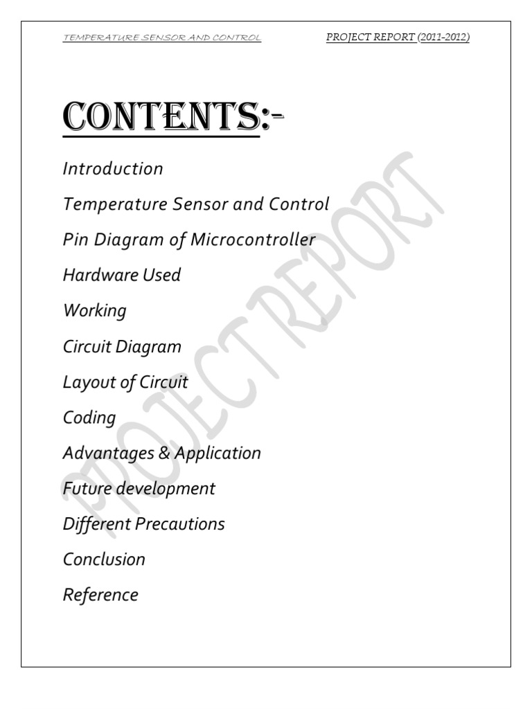 CONTENTS:Introduction Temperature Sensor and Control Pin Diagram of Microcontroller Hardware Used Working Circuit Diagram Layout of Circuit Coding Advantages & Application Future development Different Precautions Conclusion Reference