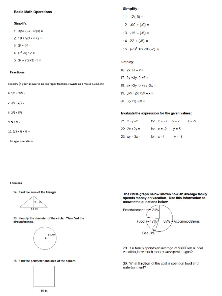 21. 8 7. 4/15 22. 6 8. 5/9 23. -44 9. 1 - 1/2 10. 19/2 Integer Operations 11. -60 12. 10 13. -9 14. 14 15. 37 Formulas 24. 9.8 in