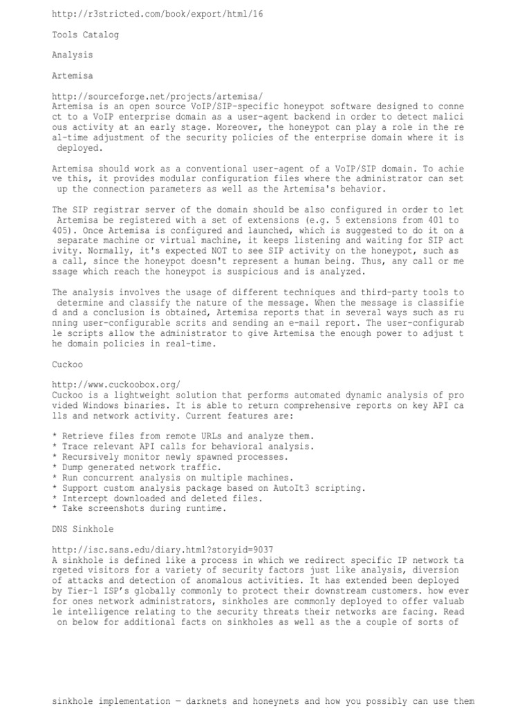 net/projects/artemisa/ Artemisa is an open source VoIP/SIP-specific honeypot software designed to conne ct to a VoIP enterprise domain as a user-agent backend in order to detect malici ous activity at an early stage. Moreover, the honeypot can play a role in the re al-time adjustment of the security policies of the enterprise domain where it is deployed. Artemisa should work as a conventional user-agent of a VoIP/SIP domain. To achie ve this, it provides modular configuration files where the administrator can set up the connection parameters as well as the Artemisa's behavior. The SIP registrar server of the domain should be also configured in order to let Artemisa be registered with a set of extensions (e.g. 5 extensions from 401 to 405). Once Artemisa is configured and launched, which is suggested to do it on a separate machine or virtual machine, it keeps listening and waiting for SIP act ivity. Normally, it's expected NOT to see SIP activity on the honeypot, such as a call, since the honeypot doesn't represent a human being. Thus, any call or me ssage which reach the honeypot is suspicious and is analyzed. The analysis involves the usage of different techniques and third-party tools to determine and classify the nature of the message. When the message is classifie d and a conclusion is obtained, Artemisa reports that in several ways such as ru nning user-configurable scrits and sending an e-mail report. The user-configurab le scripts allow the administrator to give Artemisa the enough power to adjust t he domain policies in real-time. Cuckoo http://www.cuckoobox.org/ Cuckoo is a lightweight solution that performs automated dynamic analysis of pro vided Windows binaries. It is able to return comprehensive reports on key API ca lls and network activity. Current features are: * * * * * * * * Retrieve files from remote URLs and analyze them. Trace relevant API calls for behavioral analysis. Recursively monitor newly spawned processes. Dump generated network traffic. Run concurrent analysis on multiple machines. Support custom analysis package based on AutoIt3 scripting. Intercept downloaded and deleted files. Take screenshots during runtime.