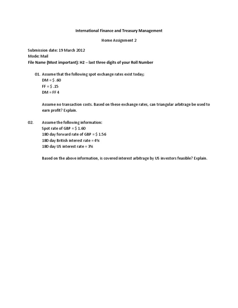 (Most important): H2 last three digits of your Roll Number 01. Assume that the following spot exchange rates exist today; DM = $ .60 FF = $ .15 DM = FF 4 Assume no transaction costs. Based on these exchange rates, can triangular arbitrage be used to earn profit? Explain. 02. Assume the following information: Spot rate of GBP = $ 1.60 180 day forward rate of GBP = $ 1.56 180 day British interest rate = 4% 180 day US interest rate = 3% Based on the above information, is covered interest arbitrage by US investors feasible? Explain.