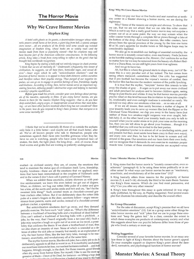 Stephen king: horror movies appeal to dark elements within ourselves. He says they defuse people's destructive urges and maintain psychic equilibrium. If you enjoy horror movies, are you dra…