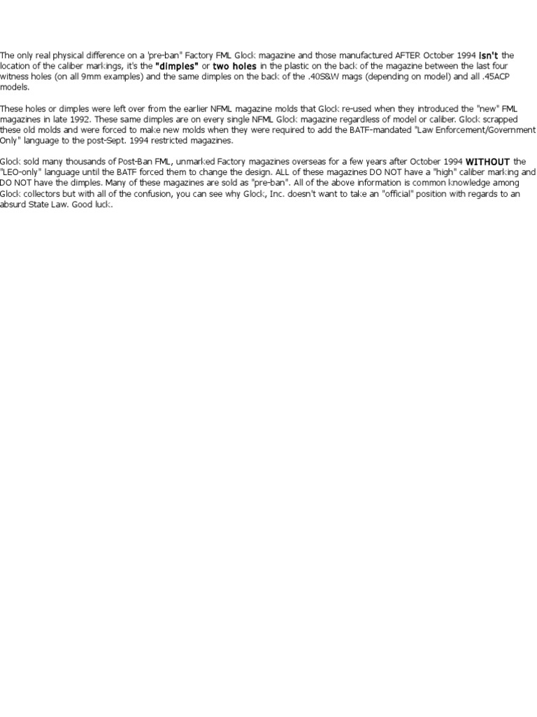1994 isn't the location of the caliber markings, it's the "dimples" or two holes in the plastic on the back of the magazine between the last four witness holes (on all 9mm examples) and the same dimples on the back of the .40S&W mags (depending on model) and all .45ACP models. These holes or dimples were left over from the earlier NFML magazine molds that Glock re-used when they introduced the "new" FML magazines in late 1992. These same dimples are on every single NFML Glock magazine regardless of model or caliber. Glock scrapped these old molds and were forced to make new molds when they were required to add the BATF-mandated "Law Enforcement/Government Only" language to the post-Sept. 1994 restricted magazines. Glock sold many thousands of Post-Ban FML, unmarked Factory magazines overseas for a few years after October 1994 WITHOUT the "LEO-only" language until the BATF forced them to change the design. ALL of these magazines DO NOT have a "high" caliber marking and DO NOT have the dimples. Many of these magazines are sold as "pre-ban". All of the above information is common knowledge among Glock collectors but with all of the confusion, you can see why Glock, Inc. doesn't want to take an "official" position with regards to an absurd State Law. Good luck.