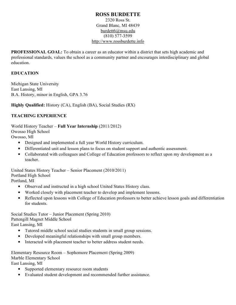 2320 Ross St. Grand Blanc, MI 48439 burdett6@[Link] (810) 577-3599 [Link] PROFESSIONAL GOAL: To obtain a career as an educator within a district that sets high academic and professional standards, values the school as a community partner and encourages interdisciplinary and global education. EDUCATION Michigan State University East Lansing, MI B.A. History, minor in English, GPA 3.76 Highly Qualified: History (CA), English (BA), Social Studies (RX) TEACHING EXPERIENCE World History Teacher Full Year Internship (2011/2012) Owosso High School Owosso, MI Designed and implemented a full year World History curriculum. Differentiated unit and lesson plans to focus on student support and authentic assessment. Collaborated with colleagues and College of Education professors to reflect upon my development as a teacher. United States History Teacher Senior Placement (2010/2011) Portland High School Portland, MI Observed and instructed in a high school United States History class. Worked closely with placement teacher to develop and implement lessons. Reflected upon lessons with College of Education professors to better achieve lesson goals and differentiation for students. Social Studies Tutor Junior Placement (Spring 2010) Pattengill Magnet Middle School East Lansing, MI Tutored middle school social studies students in small group sessions. Developed meaningful relationships with small group members. Interacted with placement teacher to better address student needs. Elementary Resource Room Sophomore Placement (Spring 2009) Marble Elementary School East Lansing, MI Supported elementary resource room students Evaluated student development and recommended further assistance.