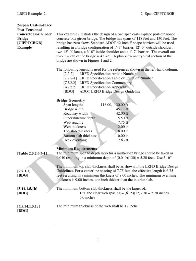 This example illustrates the design of a two span cast-in-place post-tensioned concrete box girder bridge. The bridge has spans of 118 feet and 130 feet. The bridge has zero skew. Standard ADOT 42-inch F-shape barriers will be used resulting in a bridge configuration of 1-7 barrier, 12-0 outside shoulder, two 12-0 lanes, a 6-0 inside shoulder and a 1-7 barrier. The overall outto-out width of the bridge is 45-2. A plan view and typical section of the bridge are shown in Figures 1 and 2. The following legend is used for the references shown in the left-hand column: [2.2.2] LRFD Specification Article Number [2.2.2-1] LRFD Specification Table or Equation Number [C2.2.2] LRFD Specification Commentary [A2.2.2] LRFD Specification Appendix [BDG] ADOT LRFD Bridge Design Guideline Bridge Geometry Span lengths 118.00, 130.00 ft Bridge width 45.17 ft Roadway width 42.00 ft Superstructure depth 5.50 ft Web spacing 7.75 ft Web thickness 12.00 in Top slab thickness 8.00 in Bottom slab thickness 6.00 in Deck overhang 2.63 ft Minimum Requirements The minimum span to depth ratio for a multi-span bridge should be taken as 0.040 resulting in a minimum depth of (0.040)(130) = 5.20 feet. Use 5-6 The minimum top slab thickness shall be as shown in the LRFD Bridge Design Guidelines. For a centerline spacing of 7.75 feet, the effective length is 6.75 feet resulting in a minimum thickness of 8.00 inches. The minimum overhang thickness is 9.00 inches, one inch thicker than the interior slab. The minimum bottom slab thickness shall be the larger of: 1/30 the clear web spacing = (6.75)(12) / 30 = 2.70 inches 6.0 inches The minimum thickness of the web shall be 12 inche