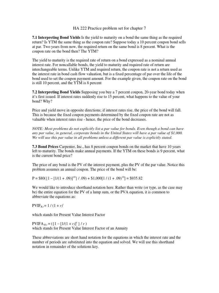 7.1 Interpreting Bond Yields Is the yield to maturity on a bond the same thing as the required return? Is YTM the same thing as the coupon rate? Suppose today a 10 percent coupon bond sells at par. Two years from now, the required return on the same bond is 8 percent. What is the coupon rate on the bond then? The YTM? The yield to maturity is the required rate of return on a bond expressed as a nominal annual interest rate. For noncallable bonds, the yield to maturity and required rate of return are interchangeable terms. Unlike YTM and required return, the coupon rate is not a return used as the interest rate in bond cash flow valuation, but is a fixed percentage of par over the life of the bond used to set the coupon payment amount. For the example given, the coupon rate on the bond is still 10 percent, and the YTM is 8 percent 7.2 Interpreting Bond Yields Supposing you buy a 7 percent coupon, 20-year bond today when its first issued. If interest rates suddenly rise to 15 percent, what happens to the value of your bond? Why? Price and yield move in opposite directions; if interest rates rise, the price of the bond will fall. This is because the fixed coupon payments determined by the fixed coupon rate are not as valuable when interest rates rise - hence, the price of the bond decreases. NOTE: Most problems do not explicitly list a par value for bonds. Even though a bond can have any par value, in general, corporate bonds in the United States will have a par value of $1,000. We will use this par value in all problems unless a different par value is explicitly stated. 7.3 Bond Prices Carpenter, Inc., has 8 percent coupon bonds on the market that have 10 years left to maturity. The bonds make annual payments. If the YTM on these bonds is 9 percent, what is the current bond price? The price of any bond is the PV of the interest payment, plus the PV of the par value. Notice this problem assumes an annual coupon. The price of the bond will be: P = $80({1 [1/(1 + .09)]10} / .09) + $1,000[1 / (1 + .09)10] = $935.82 We would like to introduce shorthand notation here. Rather than write (or type, as the case may be) the entire equation for the PV of a lump sum, or the PVA equation, it is common to abbreviate the equations as: PVIFR,t = 1 / (1 + r)t which stands for Present Value Interest Factor PVIFA R,t = ({1 [1/(1 + r)]t } / r ) which stands for Present Value Interest Factor of an Annuity These abbreviations are short hand notation for the equations in which the interest rate and the number of periods are substituted into the equation and solved. We will use this shorthand notation in remainder of the solutions key.
