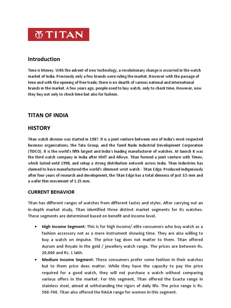 Titan has different ranges of watches from different tastes and styles. After carrying out an in-depth market study, Titan identified three distinct market segments for its watches. These segments are determined based on benefit and income level. High Income Segment: This is for high income/ elite consumers who buy watch as a fashion accessory not as a mere instrument showing time. They are also willing to buy a watch on impulse. The price tag does not matter to them. Titan offered Aurum and Royale in the gold / jewellery watch range. The prices are between Rs. 20,000 and Rs. 1 lakh. Medium Income Segment: These consumers prefer some fashion in their watches but to them price does matter. While they have the capacity to pay the price required for a good watch, they will not purchase a watch without comparing various offers in the market. For this segment, Titan offered the Exacta range in stainless steel, aimed at withstanding the rigors of daily life. The price range is Rs. 500-700. Titan also offered the RAGA range for women in this segment.