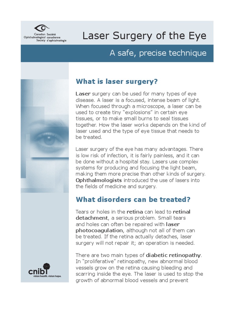 Laser surgery can be used for many types of eye disease. A laser is a focused, intense beam of light. When focused through a microscope, a laser can be used to create tiny explosions in certain eye tissues, or to make small burns to seal tissues together. How the laser works depends on the kind of laser used and the type of eye tissue that needs to be treated. Laser surgery of the eye has many advantages. There is low risk of infection, it is fairly painless, and it can be done without a hospital stay. Lasers use complex systems for producing and focusing the light beam, making them more precise than other kinds of surgery. Ophthalmologists introduced the use of lasers into the fields of medicine and surgery.