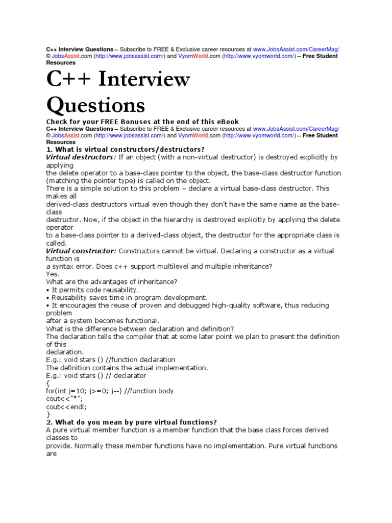 1. What is virtual constructors/destructors? Virtual destructors: If an object (with a non-virtual destructor) is destroyed explicitly by applying the delete operator to a base-class pointer to the object, the base-class destructor function (matching the pointer type) is called on the object. There is a simple solution to this problem declare a virtual base-class destructor. This makes all derived-class destructors virtual even though they dont have the same name as the baseclass destructor. Now, if the object in the hierarchy is destroyed explicitly by applying the delete operator to a base-class pointer to a derived-class object, the destructor for the appropriate class is called. Virtual constructor: Constructors cannot be virtual. Declaring a constructor as a virtual function is a syntax error. Does c++ support multilevel and multiple inheritance? Yes. What are the advantages of inheritance? It permits code reusability. Reusability saves time in program development. It encourages the reuse of proven and debugged high-quality software, thus reducing problem after a system becomes functional. What is the difference between declaration and definition? The declaration tells the compiler that at some later point we plan to present the definition of this declaration. E.g.: void stars () //function declaration The definition contains the actual implementation. E.g.: void stars () // declarator { for(int j=10; j>=0; j--) //function body cout<<*; cout<<endl; } 2. What do you mean by pure virtual functions? A pure virtual member function is a member function that the base class forces derived classes to provide. Normally these member functions have no implementation. Pure virtual functions are