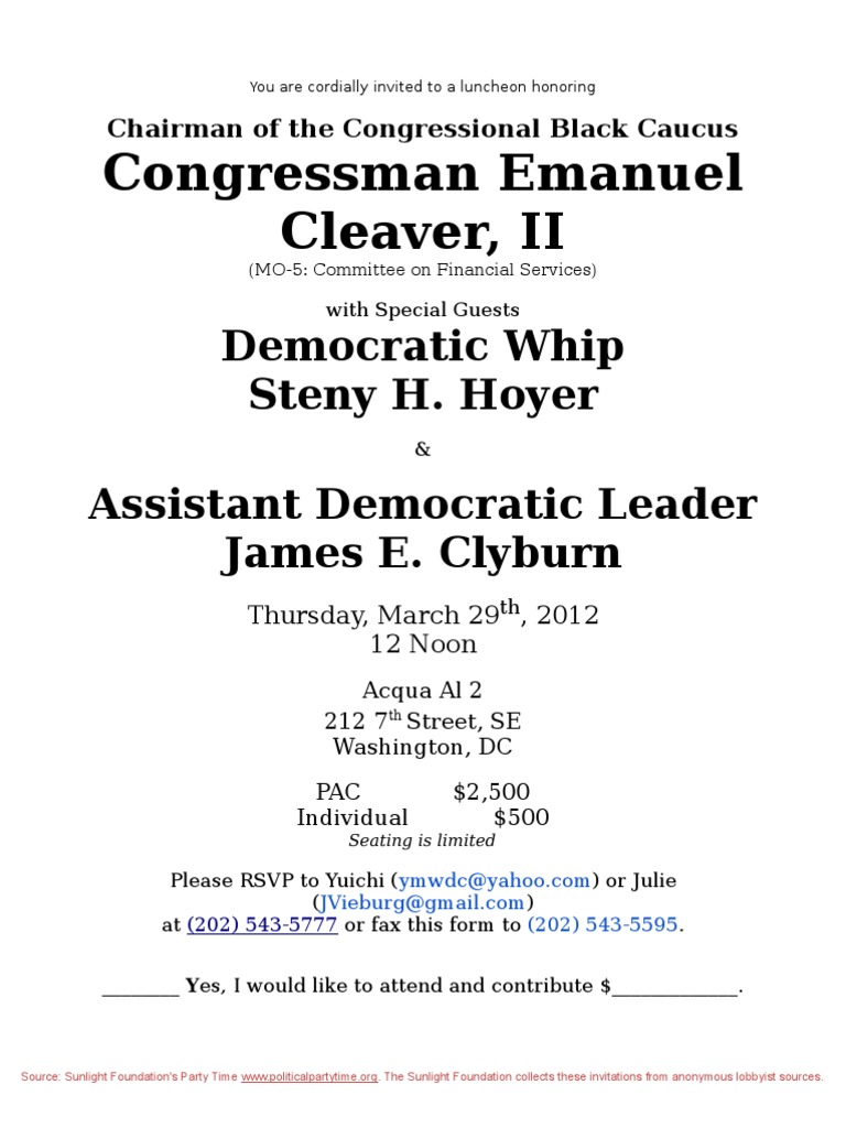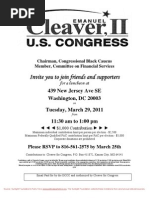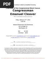 ________ No, I cannot attend, but I would like to contribute $______. Name____________________________________________ Employer___________________________________________ Occupation ____________________________ Phone_______________ Email____________________________________ Please make checks payable to: Cleaver for Congress: 236 Massachusetts Avenue, NE, Suite 603, Washington, DC 20002