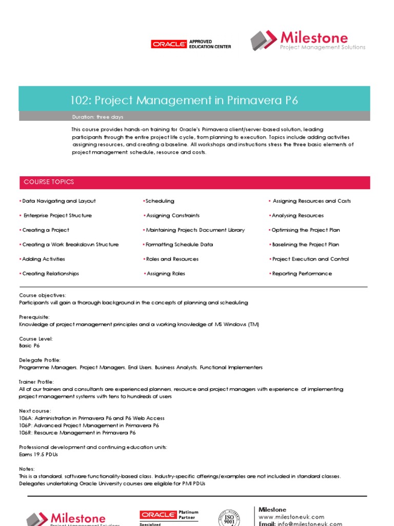 Course objectives: Participants will gain a thorough background in the concepts of planning and scheduling Prerequisite: Knowledge of project management principles and a working knowledge of MS Windows (TM) Course Level: Basic P6 Delegate Profile: Programme Managers, Project Managers, End Users, Business Analysts, Functional Implementers Trainer Profile: All of our trainers and consultants are experienced planners, resource and project managers with experience of implementing project management systems with tens to hundreds of users Next course: 106A: Administration in Primavera P6 and P6 Web Access 106P: Advanced Project Management in Primavera P6 106R: Resource Management in Primavera P6