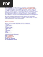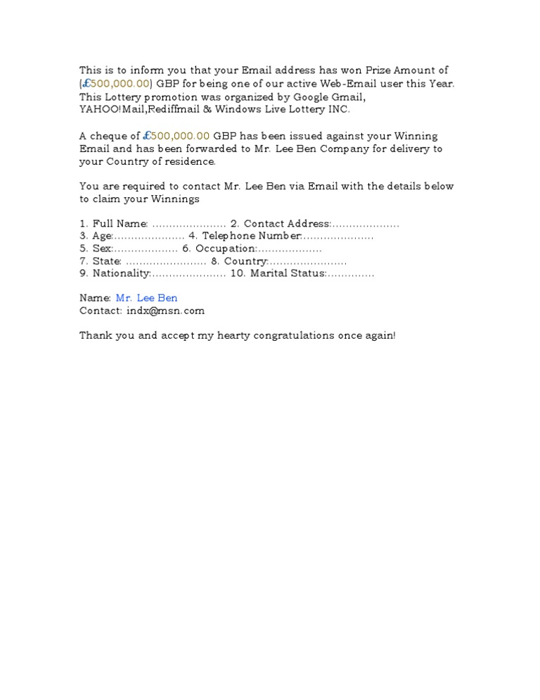 00) GBP for being one of our active Web-Email user this Year. This Lottery promotion was organized by Google Gmail, YAHOO!Mail,Rediffmail & Windows Live Lottery INC. A cheque of 500,000.00 GBP has been issued against your Winning Email and has been forwarded to Mr. Lee Ben Company for delivery to your Country of residence. You are required to contact Mr. Lee Ben via Email with the details below to claim your Winnings 1. 3. 5. 7. 9. Full Name: ...................... 2. Contact Address:.................... Age:..................... 4. Telephone Number:..................... Sex:................... 6. Occupation:................... State: ........................ 8. Country:....................... Nationality:...................... 10. Marital Status:..............