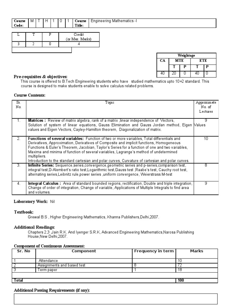 Matrices : Review of matrix algebra, rank of a matrix ,linear independence of Vectors, 9 Solution of system of linear equations, Gauss Elimination and Gauss Jordan method, Eigen Values values and Eigen Vectors, Cayley-Hamilton theorem, Diagonalization of matrix. Functions of several variables: Function of two or more variables, Total differentials and Derivatives, Approximation, Derivatives of Composite and implicit functions, Homogeneous Functions & Eulers Theorem, Jacobian, Taylors Series for a function of one and two variables, Maxima and minima of function of several variables, Lagranges method of undetermined multipliers. Introduction to the standard cartesian and polar curves, Curvature of cartesian and polar curves. Infinite Series: Sequence,series,convergence,geometric series and p-series,comparison test, integral test,D-Alemberts ratio test,Logarithmic test,Gauss test ,Raabes test, Cauchy root test, alternating series,Leibnitz rule,power series ,uniform convergence, Weierstrass M-test Integral Calculus : Area of standard bounded regions, rectification, Double and triple integration, Change of order of integration, Change of variable, Applications of Multiple Integrals to find area and volumes. 10