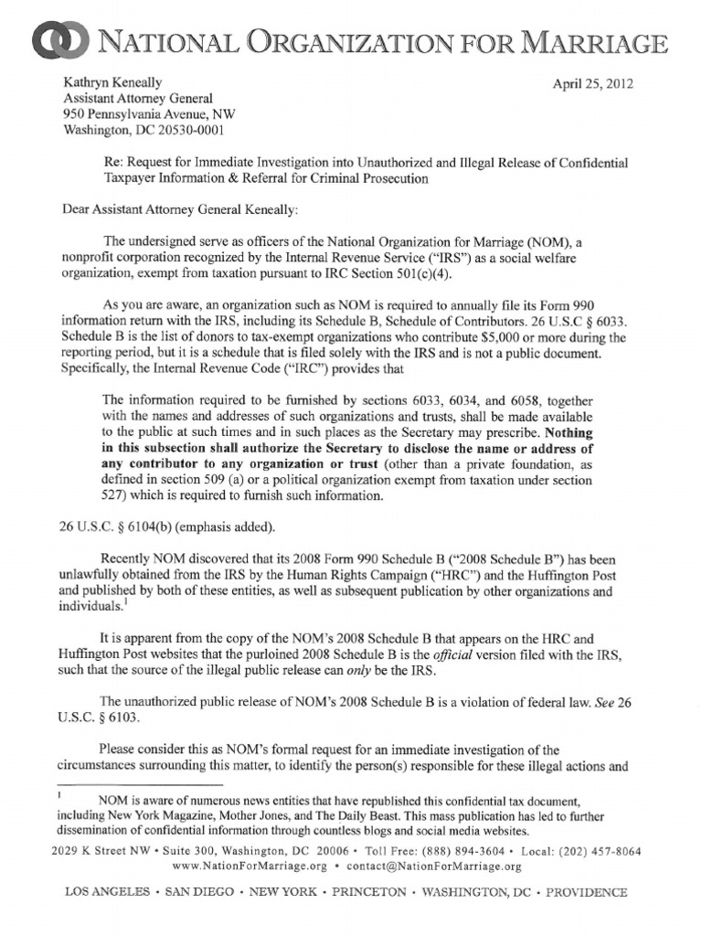 The National Organization for Marriage is asking the U.S. Department of Justice to investigate and prosecute the individuals responsible for leaking the organization’s confidential U.S. tax return and then illegally publishing it on a host of liberal websites.