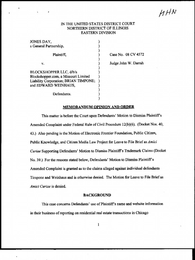 the blockshopper.com website and have linked articles on the website to the Jones Day