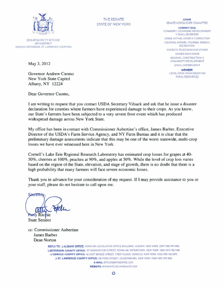 Letter To Gov. Cuomo Re Frost Damaged Crops