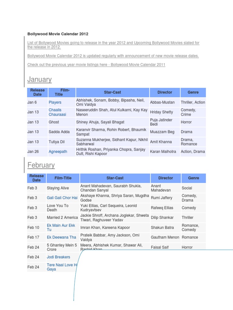 List of Bollywood Movies going to release in the year 2012 and Upcoming Bollywood Movies slated for the release in 2012. Bollywood Movie Calendar 2012 is updated regularly with announcement of new movie release dates. Check out the previous year movie listings here - Bollywood Movie Calendar 2011