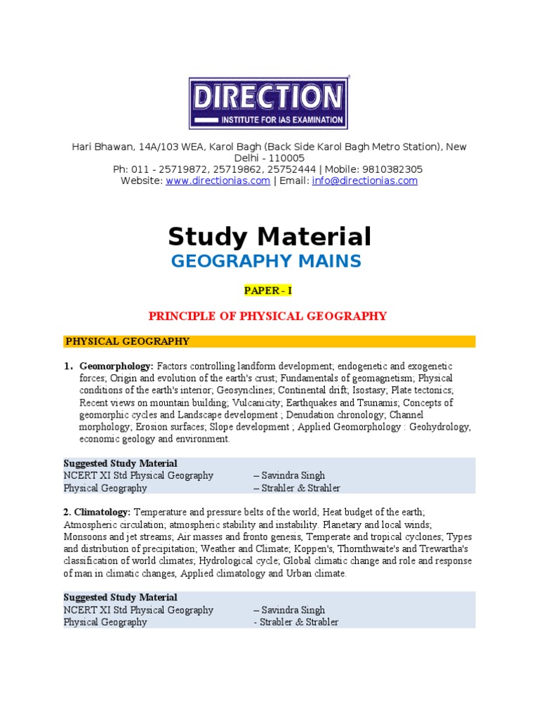forces; Origin and evolution of the earth's crust; Fundamentals of geomagnetism; Physical conditions of the earth's interior; Geosynclines; Continental drift; Isostasy; Plate tectonics; Recent views on mountain building; Vulcanicity; Earthquakes and Tsunamis; Concepts of geomorphic cycles and Landscape development ; Denudation chronology; Channel morphology; Erosion surfaces; Slope development ; Applied Geomorphology : Geohydrology, economic geology and environment. Suggested Study Material NCERT XI Std Physical Geography Physical Geography Savindra Singh Strahler & Strahler
