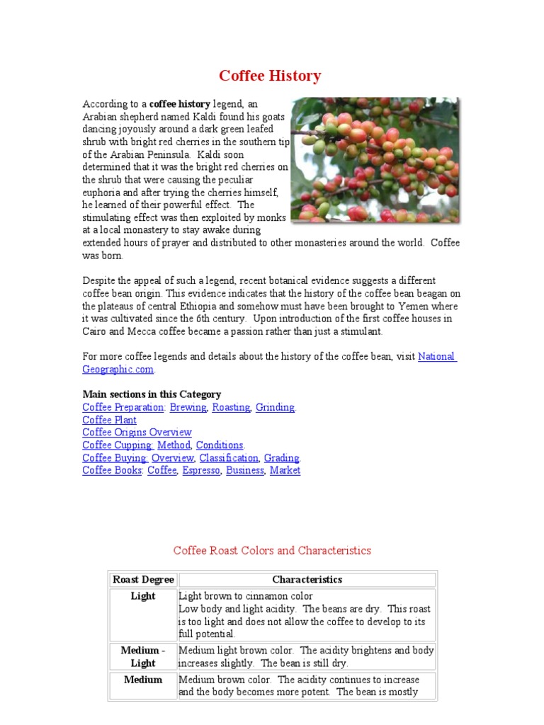 According to a coffee history legend, an Arabian shepherd named Kaldi found his goats dancing joyously around a dark green leafed shrub with bright red cherries in the southern tip of the Arabian Peninsula. Kaldi soon determined that it was the bright red cherries on the shrub that were causing the peculiar euphoria and after trying the cherries himself, he learned of their powerful effect. The stimulating effect was then exploited by monks at a local monastery to stay awake during extended hours of prayer and distributed to other monasteries around the world. Coffee was born. Despite the appeal of such a legend, recent botanical evidence suggests a different coffee bean origin. This evidence indicates that the history of the coffee bean beagan on the plateaus of central Ethiopia and somehow must have been brought to Yemen where it was cultivated since the 6th century. Upon introduction of the first coffee houses in Cairo and Mecca coffee became a passion rather than just a stimulant. For more coffee legends and details about the history of the coffee bean, visit National Geographic.com. Main sections in this Category Coffee Preparation: Brewing, Roasting, Grinding. Coffee Plant Coffee Origins Overview Coffee Cupping: Method, Conditions. Coffee Buying: Overview, Classification, Grading. Coffee Books: Coffee, Espresso, Business, Market