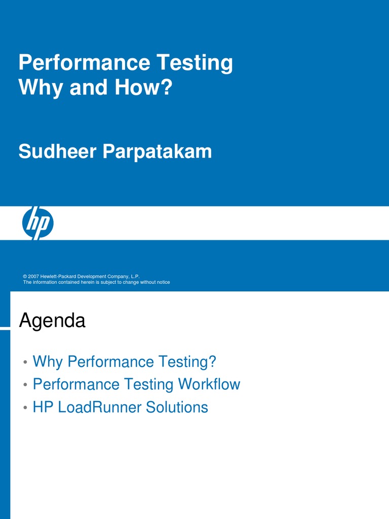 Why Performance Testing? Performance Testing Workflow HP LoadRunner Solutions