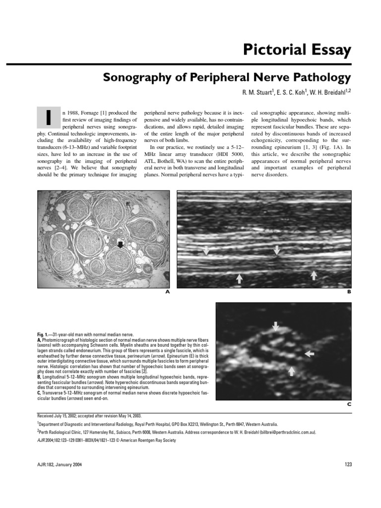 cal sonographic appearance, showing multiple longitudinal hypoechoic bands, which represent fascicular bundles. These are separated by discontinuous bands of increased echogenicity, corresponding to the surrounding epineurium [1, 3] (Fig. 1A). In this article, we describe the sonographic appearances of normal peripheral nerves and important examples of peripheral nerve disorders.