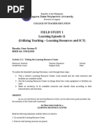 After you have observed, classify the resources available in the learning resource center. Name of Center Observed: Instructional Media Center (IMC), Amphitheater, Speech Laboratory, Audio-Visual Room, Computer Laboratory, Library Date of Observation: Name of Observer: Course / Year / School: St. Paul University Surigao Available Learning Resources (Enumerate in bullet form) 1. Print Resources Not available 2. Audio Resources Graphic Equalizer Mixer Karaoke Microphone Television VDC / DVD Player Cassette Tapes/ CDs Speaker List of Available Learning Resources Characteristics and Unique Capabilities Teaching Approaches where the Resource is Most Useful