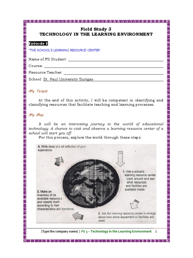 Episode 1 THE SCHOOLS LEARNING RESOURCE CENTER Name of FS Student: Course: Resource Teacher: School: St. Paul University Surigao My Target At the end of this activity, I will be competent in identifying and classifying resources that facilitate teaching and learning processes. My Map It will be an interesting journey to the world of educational technology. A chance to visit and observe a learning resource center of a school will start you off: For this process, explore the world through these steps:
