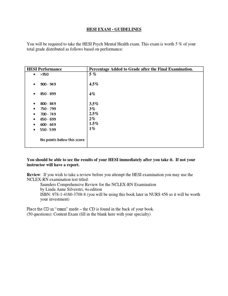 You should be able to see the results of your HESI immediately after you take it. If not your instructor will have a report. Review: If you wish to take a review before you attempt the HESI examination you may use the NCLEX-RN examination test titled: Saunders Comprehensive Review for the NCLEX-RN Examination by Linda Anne Silverstri, 4th edition ISBN: 978-1-4160-3708-8 (you will be using this book later in NURS 456 so it will be worth your investment) Place the CD in exam mode the CD is found in the back of your book. (50 questions): Content Exam (fill in the blank here with your specialty)