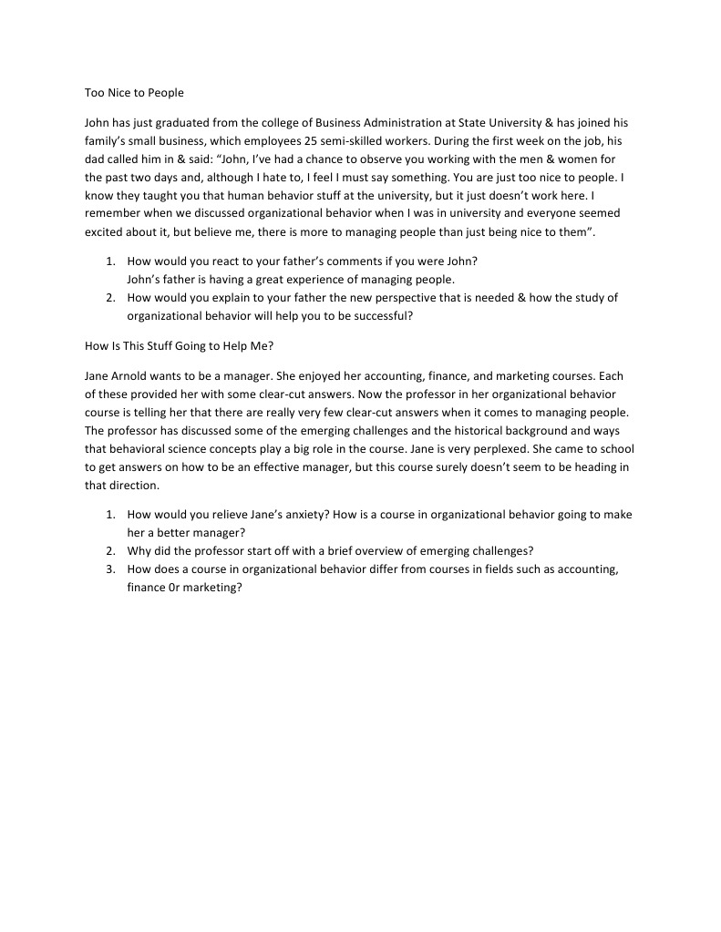 has joined his familys small business, which employees 25 semi-skilled workers. During the first week on the job, his dad called him in & said: John, Ive had a chance to observe you working with the men & women for the past two days and, although I hate to, I feel I must say something. You are just too nice to people. I know they taught you that human behavior stuff at the university, but it just doesnt work here. I remember when we discussed organizational behavior when I was in university and everyone seemed excited about it, but believe me, there is more to managing people than just being nice to them. 1. How would you react to your fathers comments if you were John? Johns father is having a great experience of managing people. 2. How would you explain to your father the new perspective that is needed & how the study of organizational behavior will help you to be successful? How Is This Stuff Going to Help Me? Jane Arnold wants to be a manager. She enjoyed her accounting, finance, and marketing courses. Each of these provided her with some clear-cut answers. Now the professor in her organizational behavior course is telling her that there are really very few clear-cut answers when it comes to managing people. The professor has discussed some of the emerging challenges and the historical background and ways that behavioral science concepts play a big role in the course. Jane is very perplexed. She came to school to get answers on how to be an effective manager, but this course surely doesnt seem to be heading in that direction. 1. How would you relieve Janes anxiety? How is a course in organizational behavior going to make her a better manager? 2. Why did the professor start off with a brief overview of emerging challenges? 3. How does a course in organizational behavior differ from courses in fields such as accounting, finance 0r marketing?