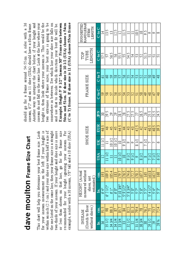 This document provides a frame size chart to help riders determine the best bicycle frame size for their body dimensions. The chart lists inseam measurements along the left and shoe sizes al…