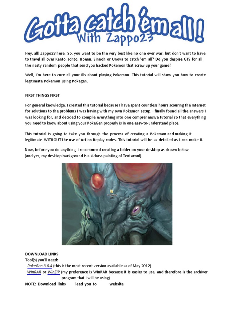 DOWNLOAD LINKS Tool(s) you'll need: PokeGen 3.0.4 (this is the most recent version available as of May 2012) WinRAR or WinZIP (my preference is WinRAR because it is easier to use, and therefore is the archiver program that I will be using) NOTE: Download links lead you to website