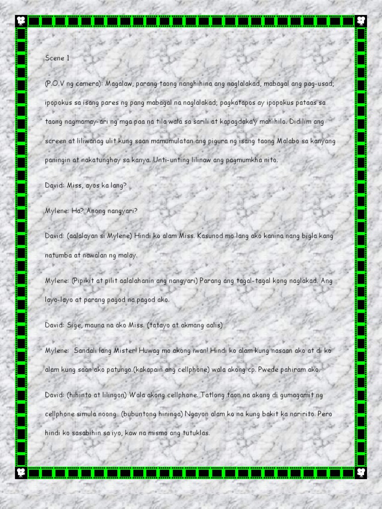 V ng camera): Magalaw, parang taong nanghihina ang naglalakad, mabagal ang pag-usad; ipopokus sa isang pares ng pang mabagal na naglalakad; pagkatapos ay ipopokus pataas sa taong nagmamay-ari ng mga paa na tila wala sa sarili at kapagdakay mahihilo. Didilim ang screen at liliwanag ulit kung saan mamumulatan ang pigura ng isang taong Malabo sa kanyang paningin at nakatunghay sa kanya. Unti-unting lilinaw ang pagmumkha nito. David: Miss, ayos ka lang? Mylene: Ha? Anong nangyari? David: (aalalayan si Mylene) Hindi ko alam Miss. Kasunod mo lang ako kanina nang bigla kang natumba at nawalan ng malay. Mylene: (Pipikit at pilit aalalahanin ang nangyari) Parang ang tagal-tagal kong naglakad. Ang layo-layo at parang pagod na pagod ako. David: Sige, mauna na ako Miss. (tatayo at akmang aalis) Mylene: Sandali lang Mister! Huwag mo akong iwan! Hindi ko alam kung nasaan ako at di ko alam kung saan ako patungo.(kakapain ang cellphone) wala akong cp. Pwede pahiram ako. David: (hihinto at lilingon) Wala akong cellphone. Tatlong taon na akong di gumagamit ng cellphone simula noong(bubuntong hininga) Ngayon alam ko na kung bakit ka naririto. Pero hindi ko sasabihin sa iyo, kaw na mismo ang tutuklas.