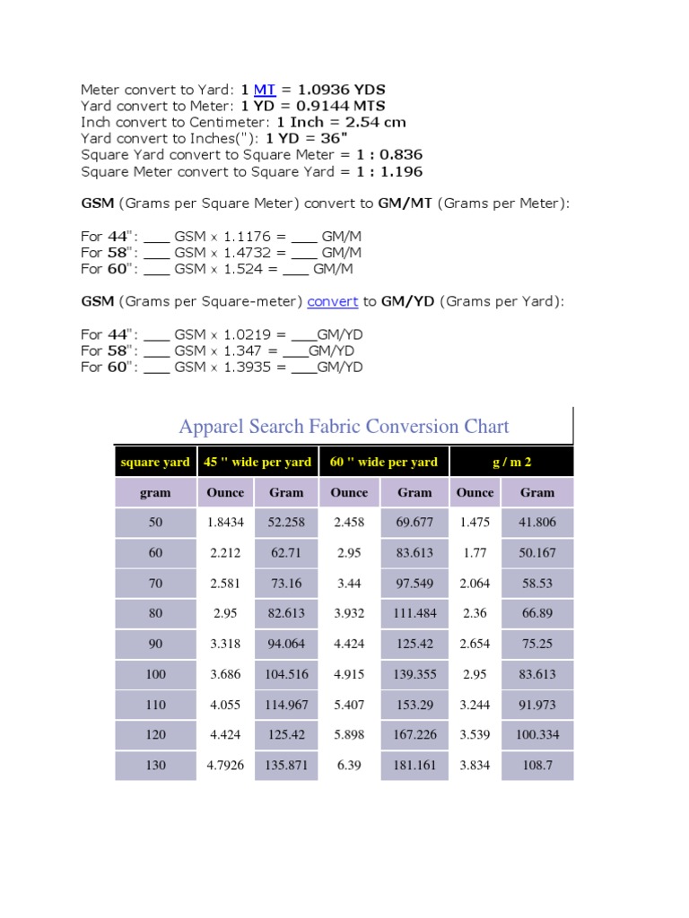Apparel Search Fabric Conversion Chart