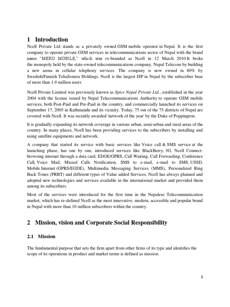 The mission of Ncell is as follows: Our mission is to connect all through our telecommunication services, create value for our customers and render quality services at all times. Focus areas of Ncell Build world class company service Secure high quality in their networks To have and efficient cost structure
