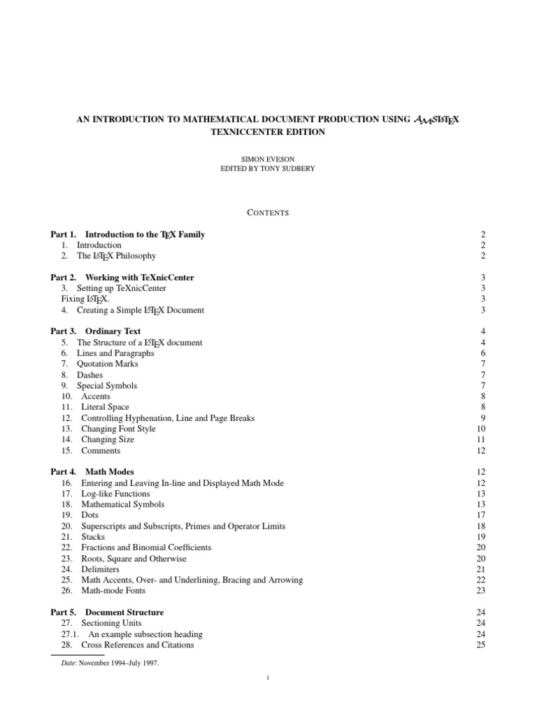 Part 1. Introduction to the TEX Family 1. I NTRODUCTION These notes provide an introduction to mathematical document production on the York computer network using A A LTEX 2 (in particular AMSLTEX), B IBTEX and makeindex. Although I have tried to cover the most important topics, there are many things I have left out. Much more information is available in the literature; for example: A AMSLTEX is thoroughly described in Gr tzers excellent book on the subject [3] (a pint to the rst person to nd both a A references to the University of York Mathematics Department). LTEX 2 , B IBTEX and makeindex are (reasonably) fully documented in Lamports ofcial user guide [5]; the earlier edition [6] is still useful. A much more detailed description (not for the faint-hearted) can be found in [1], which also includes a survey (inevitably, slightly out of date) of packages providing additional features. The knotty subject of including graphics within your document is thoroughly untangled in [2]. Finally, the underlying TEX engine that does the typesetting work is documented in [4]. I have made available online (at http://maths.york.ac.uk/www/TexLaTeXInfo the rst chapter and the rst two appendices (tables of symbols) of the rst edition of Gr tzer [3] and a cross-referenced le describing most a A common LTEX 2 commands.