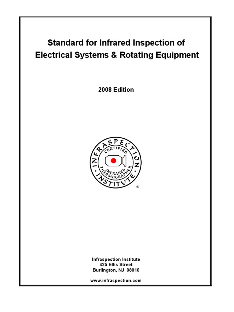This standard outlines the procedures and documentation requirements for conducting infrared inspections of electrical systems and rotating equipment. This standard covers an application which is both art and science. This document assumes that the reader is generally familiar with the science of infrared thermography. It is not intended to be an absolute step-by-step formula for conducting an infrared inspection. The use of this standard is not intended to qualify an individual using it to conduct an infrared inspection, or to analyze the resulting infrared data without formal training prior to its use. This document is intended to support infrared thermographers who have been professionally trained and certified. It must be acknowledged and understood that the misinterpretation of data that can occur without proper training and experience cannot be avoided simply by using this standard. In no event shall Infraspection Institute be liable to anyone for special, collateral, incidental or consequential damages in conjunction with or arising from use of this standard.